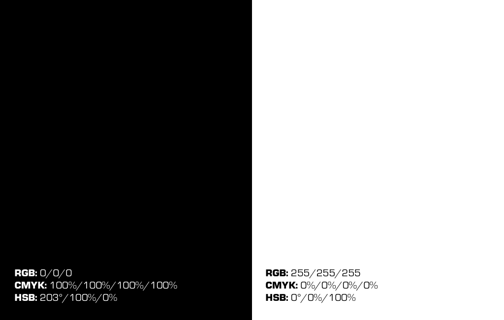 Weiß dient als Schutzraum und Hintergrundfarbe, um dem Logo und grafischen Elementen Raum zu geben. Schwarz wird ausschließlich als Schriftfarbe, für die Wortmarke und im Fließtext verwendet.