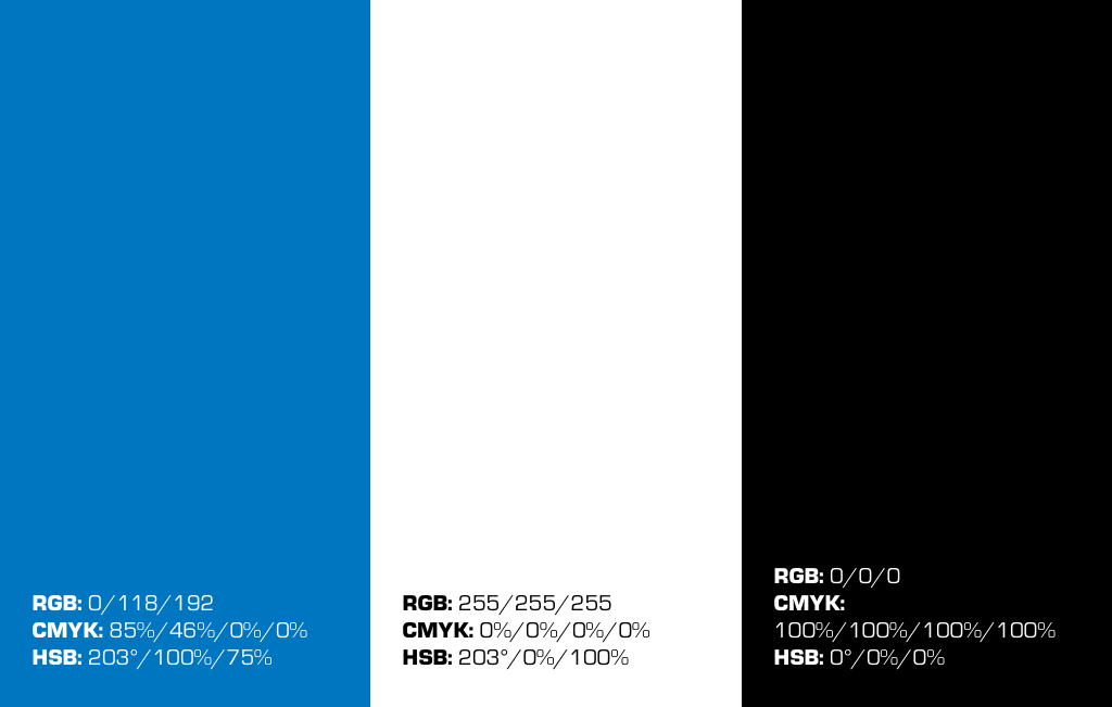 Blau ist die zentrale Markenfarbe und prägt das Logo, Überschriften, Hervorhebungen und Piktogramme. Es sorgt für eine starke Wiedererkennbarkeit und bildet einen klaren Kontrast zu Schwarz und Weiß.